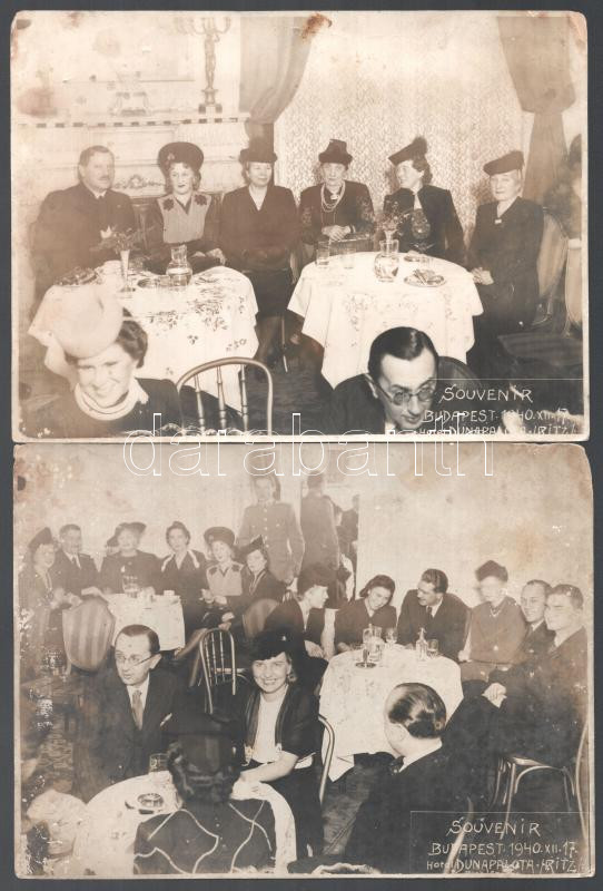 1940 Bp., Hotel Dunapalota Ritz, társasági összejövetel, 2 db nagyméretű fotó, Stemmer Vilmos fotoriporter pecsétjével jelzettek, kissé viseltes állapotban, 23,5x17,5 cm