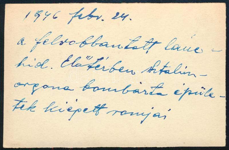 1946 Budapest, a felrobbantott Lánchíd, romos épületek, a hátoldalon f... https://www.darabanth.com/hu/484-Gyorsarveres/484.0/Fotomuveszet/Foto~1000001/1946-Budapest-a-felrobbantott-Lanchid-romos-epuletek-a-hatoldalon-feliratozott-foto-5-5x8-~II3309539