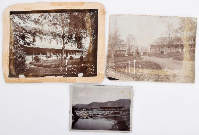 Leírás: 3 db azonosítandó, talán erdélyi helyszíneket ábrázoló keményhátú fotó, változó állapotban (részben sérült), 8,5x11,5 cm és 15x19 cm között