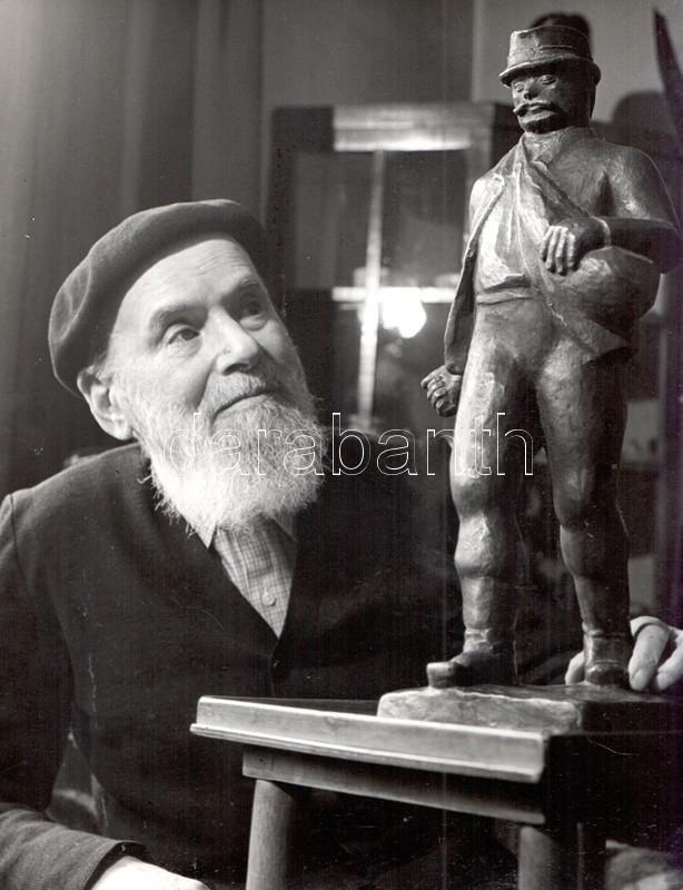 Vedres Márk (Ungvár, 1870. - Budapest, 1961.; szobrászművész) saját művét szemlélő, ülő portréja jellegzetes sapkájában, saját műtermében. Készült az 1950-es években. Vintázs, zselatinos ezüst nagyítás, mérete: 240x182 mm. Ismeretlen fényképész alkotása. Vedres Márk szobrász Münchenben tanult, Hollósy Simontól és Auguste Rodin művészektől. A Nyolcak csoport tagja. Főként kis méretű aktszobrokat készített. Kezdetben a kubizmus jegyében alkotott, az átvészelt háború után, idős korában némi behatás éri a szocialista realista elvárások irányából. A felvételen egy ebben a stílusban készített kisplasztikáját szemléli az idős mester. Műveit a Magyar Nemzeti Galéria őrzi, számos alkotása található Budapesten, Firenzében, Svájcban és az Egyesült Államokban is. Szép állapotú fotó.