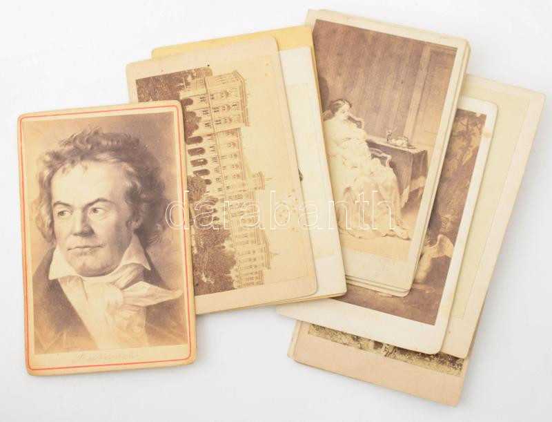 Leírás: cca 1880-1900 14 db keményhátú fotó: épületek, portrék, festmények után készült fénynyomatok, 10x6,5 cm körül