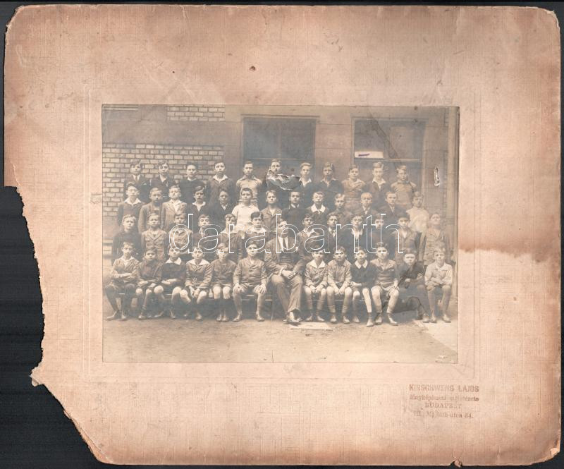 cca 1925 Bp., Bulyovszky utcai reáliskola tanulóinak csoportképe, nagyméretű, kartonra kasírozott fotó Kirschweng Lajos budapesti műterméből, sérült, ázásnyommal, 16x22 cm (karton: 28,5x34,5 cm)