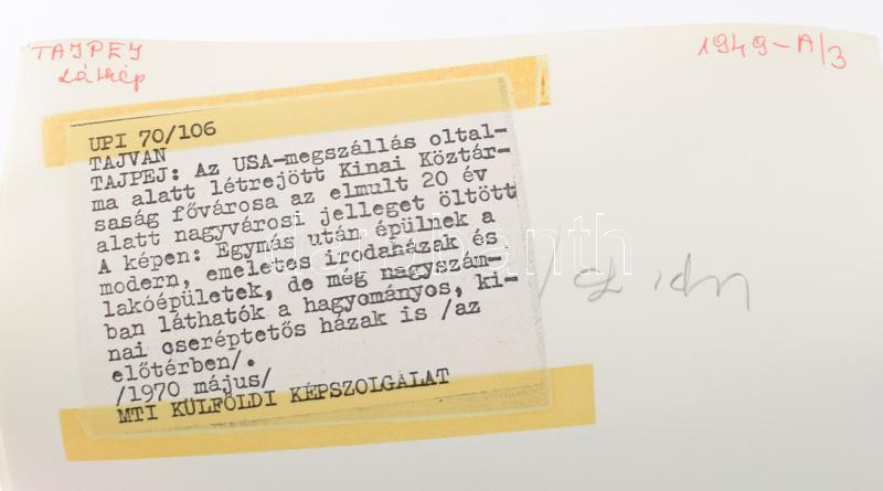 Leírás: cca 1970 Tajpej, Tajvan, 4 db sajtófotó, MTI Külföldi Képszolgálat, a hátoldalon feliratozva, vegyes állapotban, 18x13 cm
