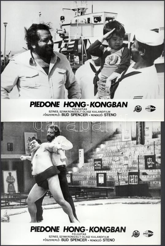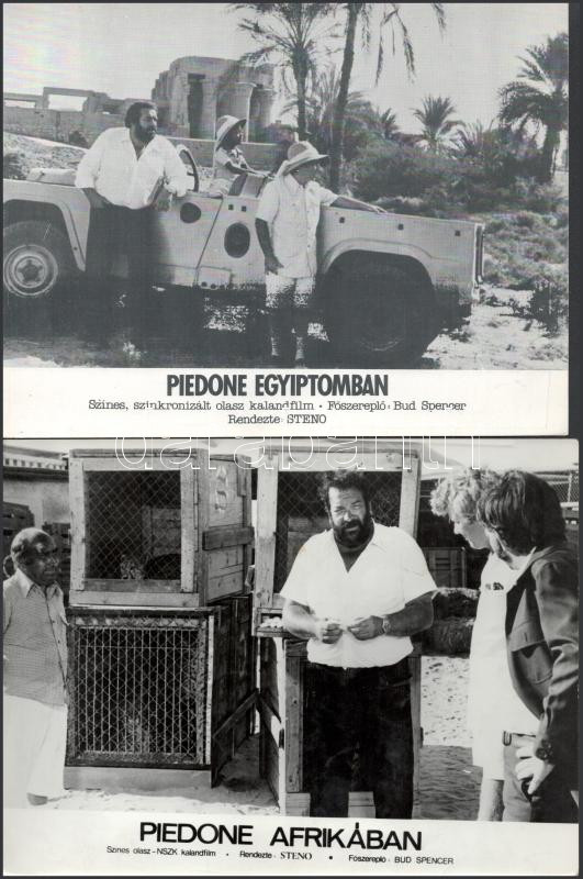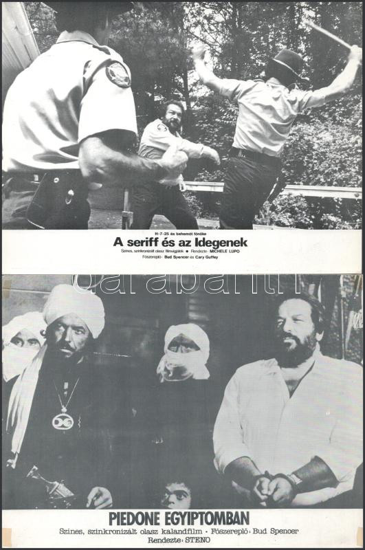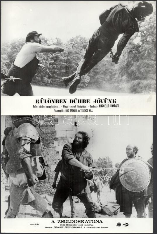 Bud Spencer filmszínész hat különböző - 1989 előtt készült - filmben, 13 db vintage produkciós filmfotó (vitrinfotó, lobbyfotó), ebből tíz kép ezüst zselatinos fotópapíron, három ofszet nyomtatás, a használatból eredő (esetleges) kisebb hibákkal, 18x24 cm
