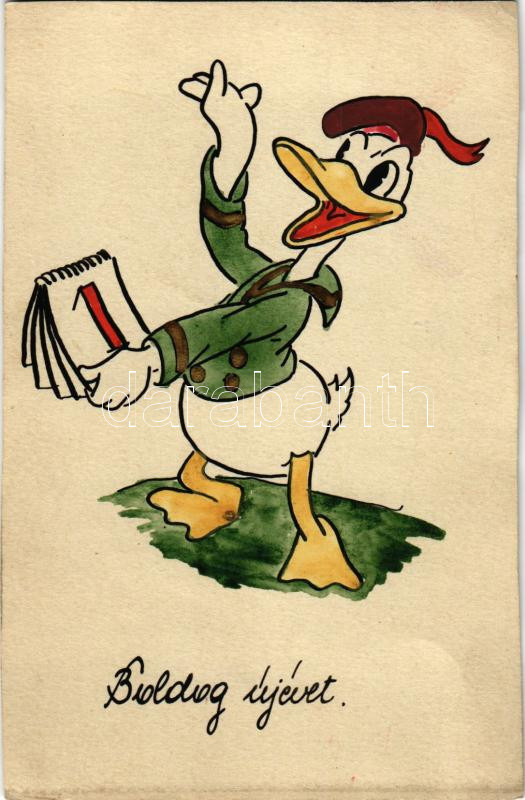Donald kacsa. Új évi üdvözlet. Saját kézzel rajzolt művészlap / Donald duck. New year greeting. Hungarian hand-drawn Disney art postcard (vágott / cut)
