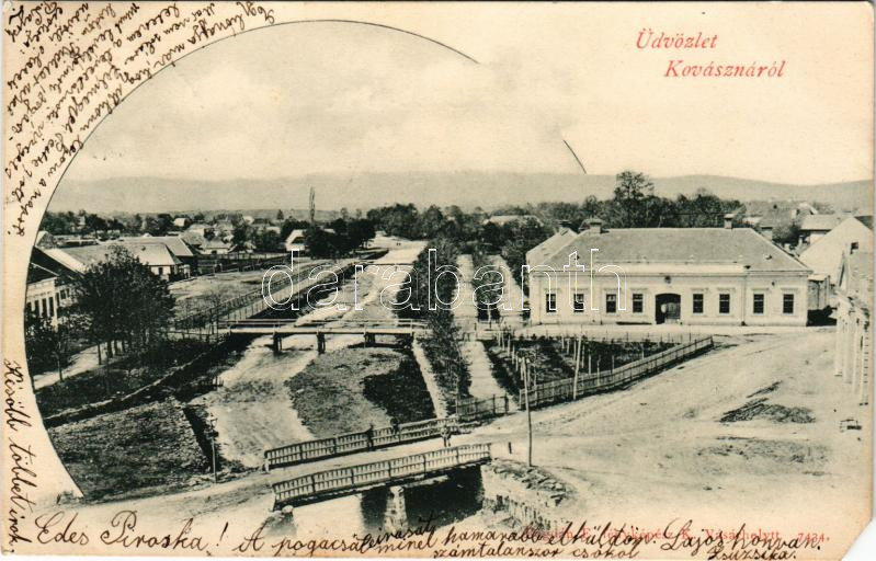 Leírás: 1900 Kovászna, Covasna; látkép, Kovászna folyó, híd. Bogdán F. fényképész kiadása (Kézdivásárhely) / general view, river, bridge (EM)
