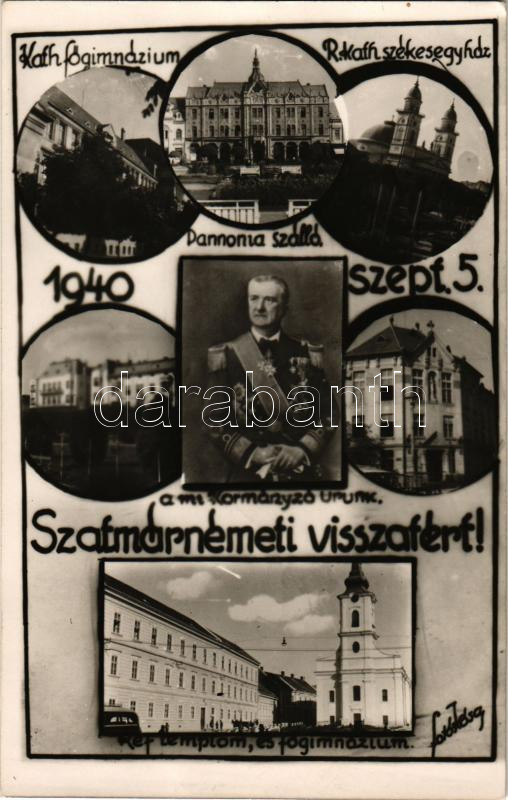 1940 Szatmárnémeti, Satu Mare; bevonulás, Horthy Miklós kormányzó, "Szatmárnémeti visszatért!" Római katolikus főgimnázium és székesegyház, Pannonia szálloda, Református templom és főgimnázium / entry of the Hungarian troops, Regent Horthy. Foto Kósa photo + "1940 Szatmárnémeti visszatért" So. Stpl.