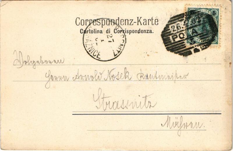 1902 Pola, K.u.k. Kriegsmarine Kriegshafen / SMS Erzherzog Albrecht osztrák-magyar páncélos csatahajó és SMS Bellona a kikötőben / Austro-Hungarian Navy port: SMS Erzherzog Albrecht ironclad warship and SMS Bellona. M. Fischer (EK)