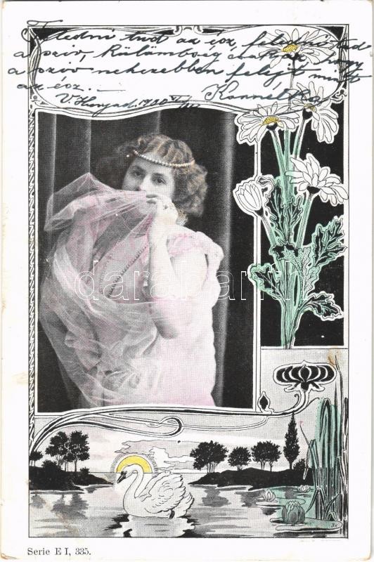 1900 Lady art postcard. Art Nouveau, floral. Serie E. I. 335. https://www.darabanth.com/hu/484-Gyorsarveres/484.0/Kepeslapok/Holgyek~2000030/1900-Lady-art-postcard-Art-Nouveau-floral-Serie-E-I-335~II2372208