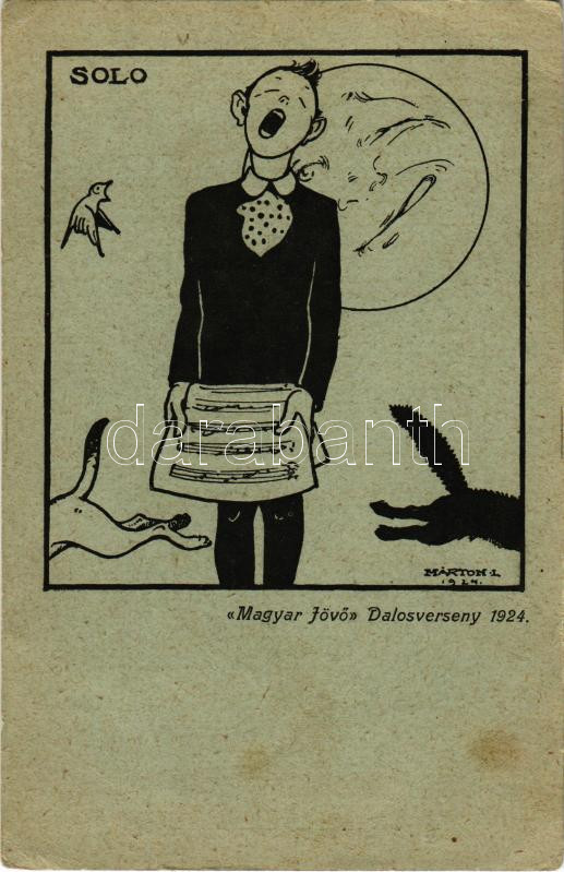 1924 SOLO Magyar Jövő Dalosverseny. Humoros zenei grafikai művészlap. Magyar Jövő Levelezőlapok 17. / Hungarian humour music postcard s: Márton L. 1924. (EK)