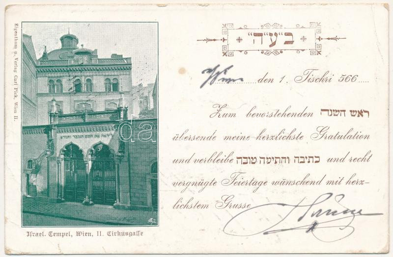 1900 Wien, Vienna; Israel. Tempel, Türkische Tempel, Synagoge, Cirkusgasse. Verlag Carl Pick / synagogue of the Turkish-Jewish community. The building was destroyed during the Kristallnacht in 1938. Hebrew text, Judaica (EB)