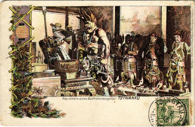 1906 Jinan, Tsinan, Tsinanfu; Das innere eines Budhistentempels / interior of a Buddhist temple. Verlag v. Max Grill Kaufhaus Tsingtau (China) Art Nouveau, floral, litho (worn corners)