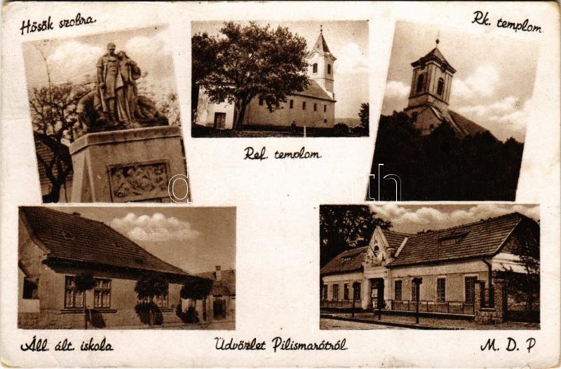 Leírás: 1951 Pilismarót, Hősök szobra, református templom, római katolikus templom, állami általános iskola, M.D.P. Földmíves Szövetkezet kiadása (EK)