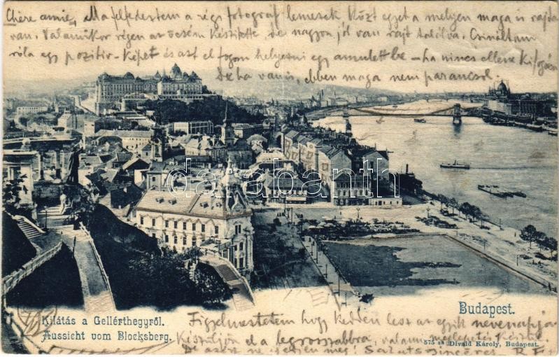 Leírás: Budapest I. Kilátás a Gellérthegyről, Királyi vár, Tabán, Döbrentei tér, piac. Divald Károly 575. sz. (fa)