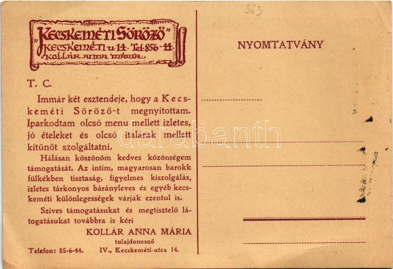 Budapest V. Kecskeméti söröző reklámlapja. Tulajdonos Kollár Anna Mári... https://www.darabanth.com/hu/484-Gyorsarveres/484.0/Kepeslapok/Magyarorszag~2000005/Budapest-V-Kecskemeti-sorozo-reklamlapja-Tulajdonos-Kollar-Anna-Maria-Kecskemeti-utca-14~II2659268