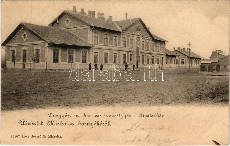 Leírás: Diósgyőr (Miskolc), M. kir. vas- és acélgyár, hivatalház. Lövy József fia kiadása (fl)