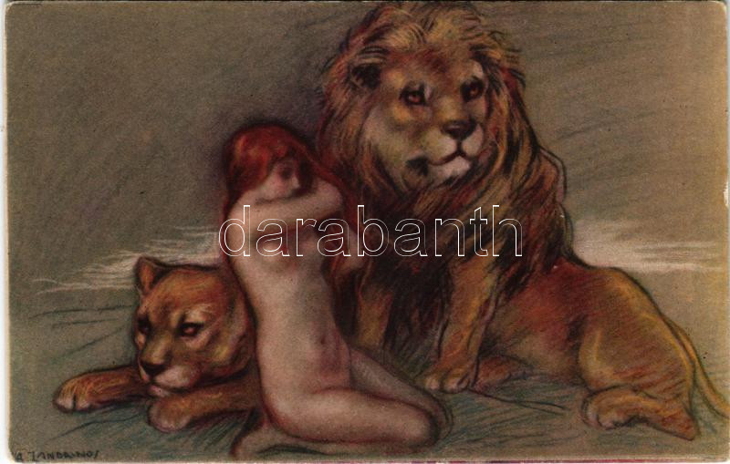 Leírás: Nude lady with lions. Italian slightly erotic art postcard. Uff. Rev. Stampa 18-4. s: A. Zandrino