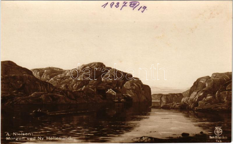 1927 Ny Hellesund, Morgen ved Ny Hellesund s: A. Nielsen https://www.darabanth.com/hu/484-Gyorsarveres/484.0/Kepeslapok/Norvegia~2000099/1927-Ny-Hellesund-Morgen-ved-Ny-Hellesund-s-A-Nielsen~II3258964