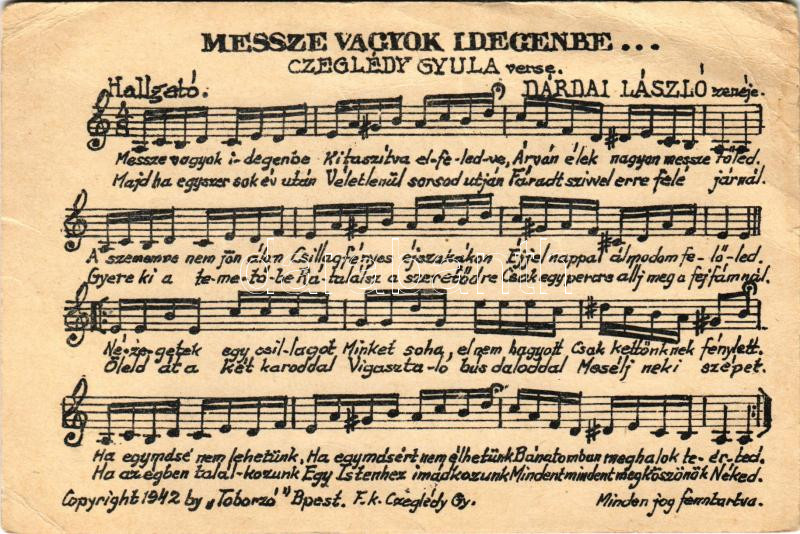 Messze vagyok idegenbe... Czeglédy Gyula verse, Dárdai László zenéje. ... https://www.darabanth.com/hu/484-Gyorsarveres/484.0/Kepeslapok/Zene-Zenesz~2000068/Messze-vagyok-idegenbe-Czegledy-Gyula-verse-Dardai-Laszlo-zeneje-1942-Toborzo-kottas-l~II3258016