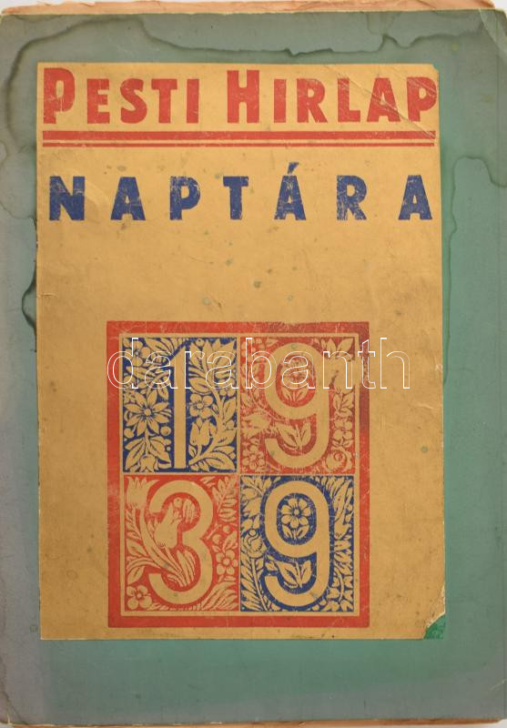 1939 Pesti Hírlap Naptára. Bp., Pesti Hírlap. Átkötött papírkötés, foltos borítóval, sérült gerinccel, a könyvtest elvált a borítótól, a címlap és az utolsó lap lejár.