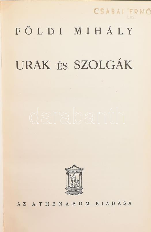 Földi Mihály: Urak és szolgák. Bp., Athenaeum. Újrakötött félbőr kötés... https://www.darabanth.com/hu/484-Gyorsarveres/484.0/Konyvek/Konyvek-Egyeb-ritkasagok~2000122/Foldi-Mihaly-Urak-es-szolgak-Bp-Athenaeum-Ujrakotott-felbor-kotes-kopottas-allapot~II3278725