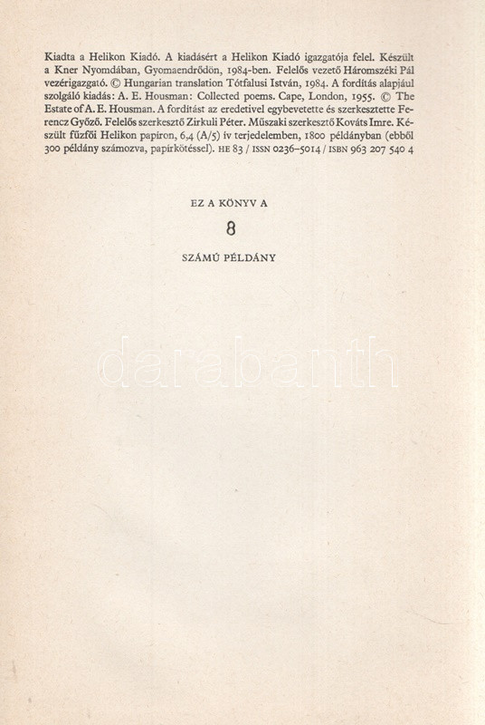 Housman, Alfred Edward: Nézzen rám, kinek élni jó... Válogatta, fordította és az utószót írta Tótfalusi István. [Budapest], (1984). Helikon Kiadó (Kner Nyomda, Gyomaendrőd). 62 + [10] p. Egyetlen kiadás. A korlátozott példányszámban készült bibliofil kötet kolofonja: "Kiadta a Helikon Kiadó. [...] Készült a Kner Nyomdában, Gyomaendrődön. Megjelent fűzfői Helikon papíron, 4,4 ív terjedelemben, 1800 példányban (ebből 300 példány számozva, Ingres papírkötéssel). Ez a könyv a 8. számú példány." Alfred Edward Housman (1859-1936) angol klasszika-filológus, egyetemi tanár és költő. Költői életműve két verseskötetre és egy kiadatlan verseskötetre korlátozódik. Az élete végéig különc agglegényként élő tudós kiadatlan versei között posztumusz jelentek meg ifjúkori viszonzatlan szerelmi lírájának darabjai, melyeket egy egyetemi társához címzett. Az elégikus költő másik jelentős témája a klasszika-filológustól váratlannak számító háborús témája, a szerzői hang a búr háború hiábavaló hősiességének témájában artikulálódik. A kötetet Szántó Tibor könyvművész tervezte. (Helikon Stúdió. III. kötet.) Feliratozott kiadói papírkötésben, illusztrált kiadói védőborítóban. Jó példány.
