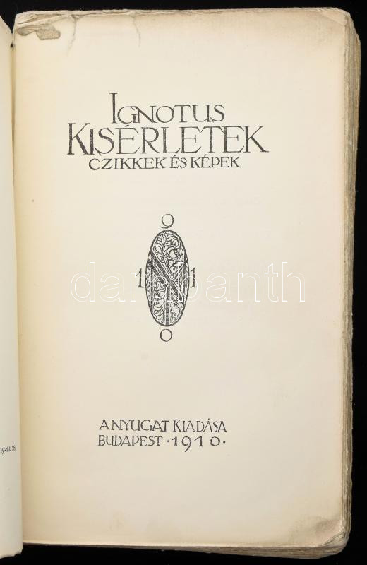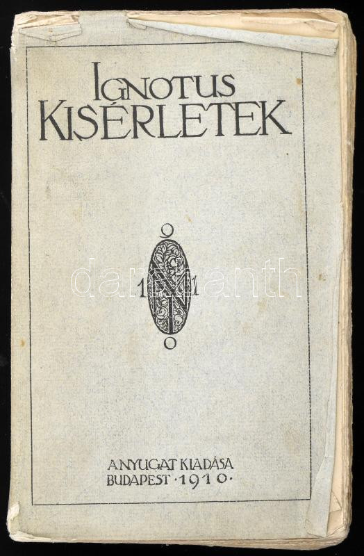 Ignotus: Kísérletek. Czikkek és képek. Bp., 1910, Nyugat, ("Jókai"-ny.), 377+5 p. Első kiadás. A borító Falus Elek munkája. Kiadói papírkötés, a borítószéleken kis sérülésekkel, gyűrődésekkel.