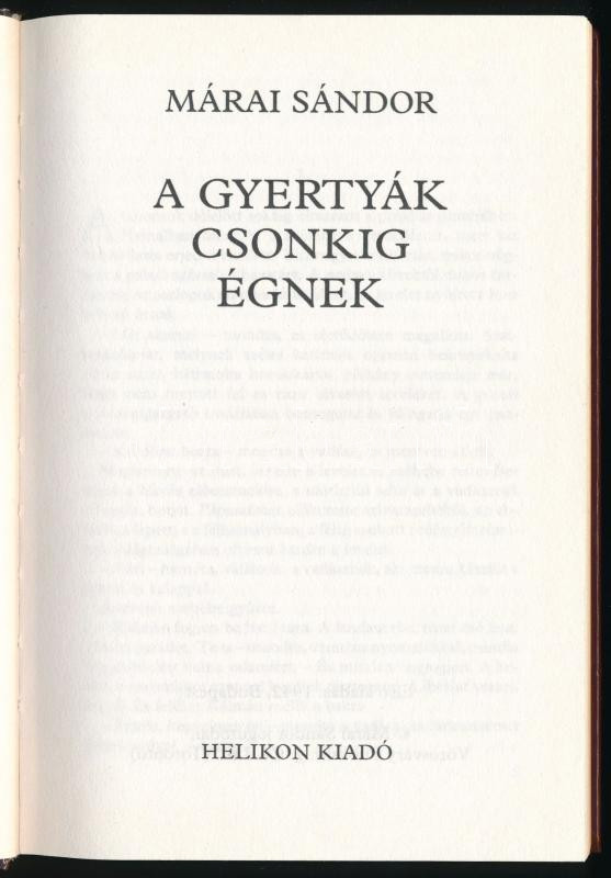 Leírás: Márai Sándor: A gyertyák csonkig égnek. (Bp., 2001), Helikon. Kiadói kartonált papírkötés.