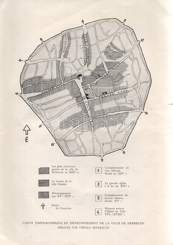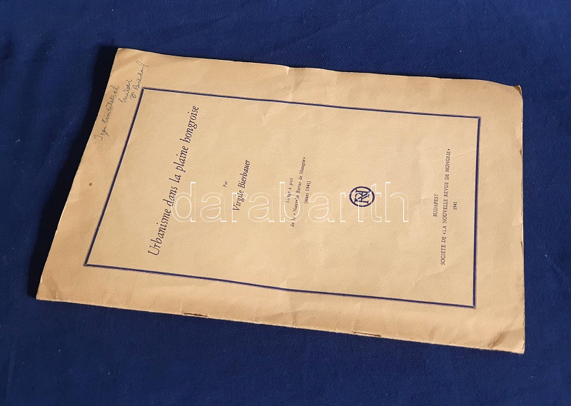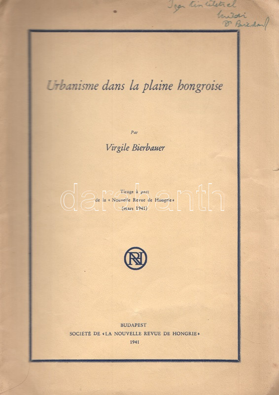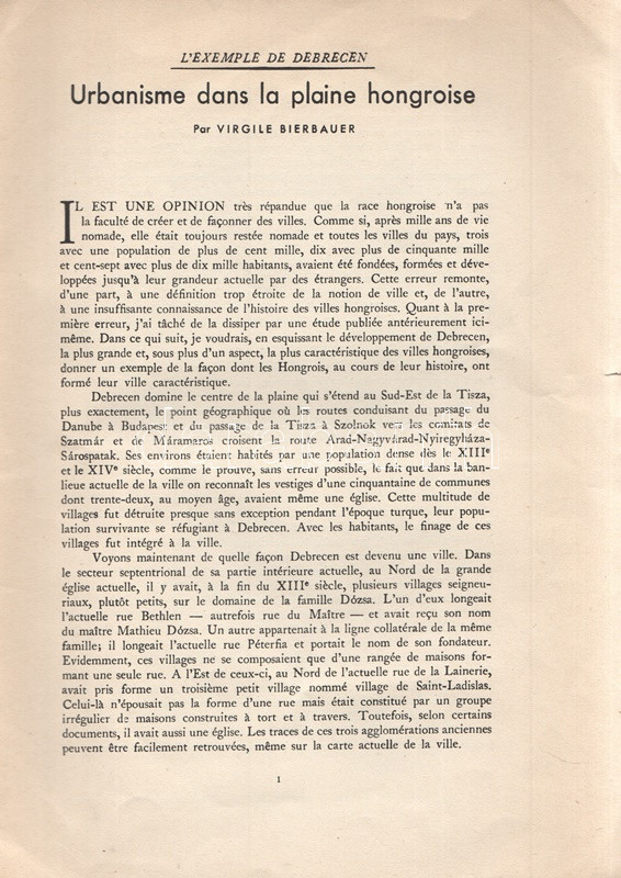 Dedikált: "Igaz tisztelettel küldi: dr. Bierbauer". Borbiró-Bierbauer Virgil (1893-1956) építész, építészettörténész, urbanista, a modernista szemléletű "Tér és Forma" című szaklap szerkesztője. Rövid, francia nyelvű tanulmányában az alföldi urbanizmus témáját járja körül, Debrecen példáján keresztül, a tanulmány kapcsolódó táblája és térképe is a cívis városhoz kapcsolódik.