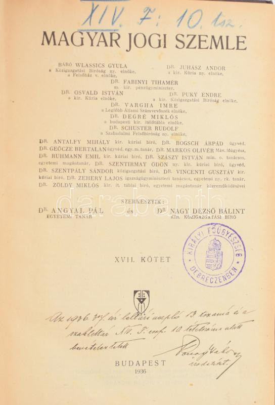 1936 Magyar Jogi Szemle XVII. köt. 1-10. szám. Szerk.: Angyal Pál, Nagy Dezső Bálint. Bp., 1936., (Attila-ny.), VIII+436 p. Átkötött félvászon-kötés, régi bélyegzésekkel.