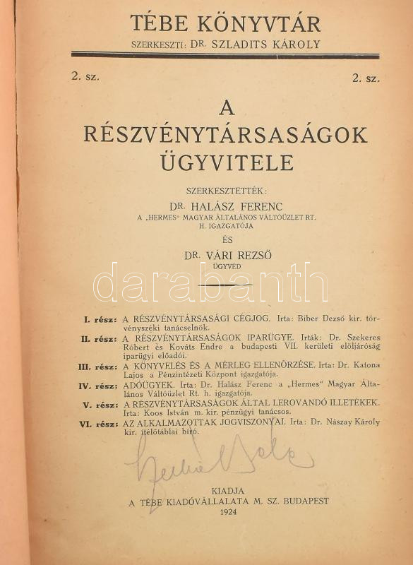 A részvénytarságok ügyvitele. Szerk.: Dr. Halász Ferenc és Dr. Vári Rezső. Tébe Könyvtár 2. sz. Bp., 1924, Tébe, 291+1 p. Átkötött félvászon-kötés, kopott borítóval, sérült gerinccel.