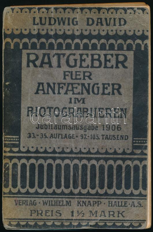 David, Ludwig: Ratgeber für Anfänger im Photographieren. Halle, 1906, Wilhelm Knapp. Jubileumi 33.-35. javított kiadás (97.-105. ezer). Kiadó papírkötésben, sérült, részben javított gerinccel, egyébként jó állapotban.