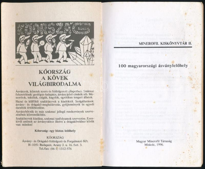 Szakáll Sándor (szerk.): 100 magyarországi ásványlelőhely. Minerofil Kiskönyvtár II. Miskolc, 1996., Magyar Minerofil Társaság. 139 p. Kiadói papírkötés, címlap és első néhány lap kissé foltos.