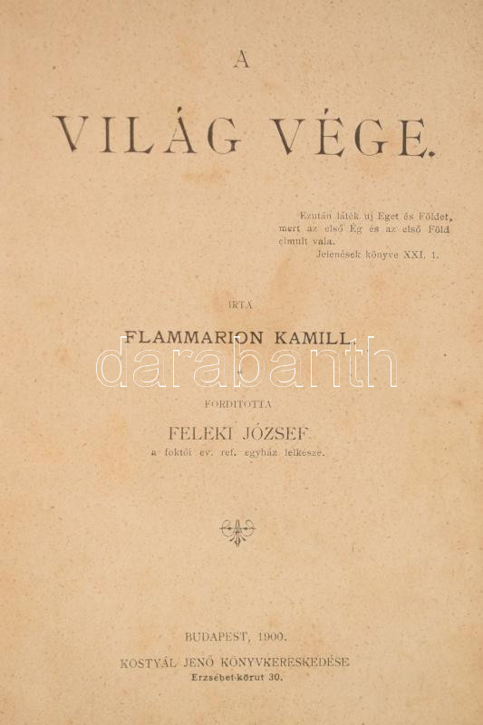 Flammarion Kamill: A világ vége. Bp., 1900, Kostyál Jenő Könyvkeresked... https://www.darabanth.com/hu/484-Gyorsarveres/484.0/Konyvek/Konyvek-Tortenelem~2000124/Flammarion-Kamill-A-vilag-vege-Bp-1900-Kostyal-Jeno-Konyvkereskedese-Felvaszon-kotes~II3290673