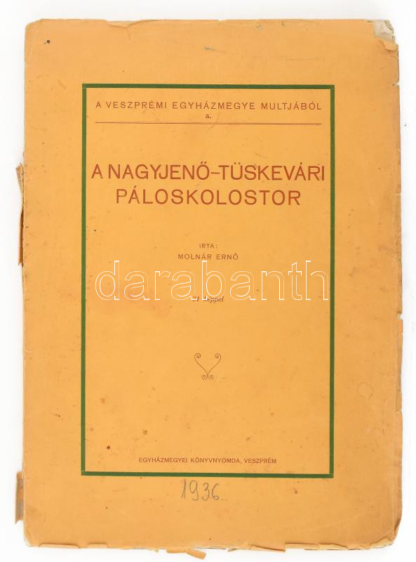 Molnár Ernő: A nagyjenő-tüskevár páloskolostor. A Veszprémi Egyházmegye Multjából 5. Veszprém, 1936., Egyházmegyei Nyomda, 128+4 p.+17 t. A budapesti Pázmány Péter Tudományegyetem Művészettörténeti és Keresztény Régészeti Intézetében készült doktori értekezés. Kiadói papírkötés, az elülső borító leszakadt, a gerinc részben hiányos, sérült, ceruzás aláhúzásokkal.