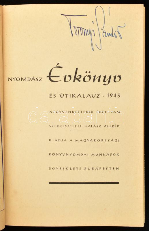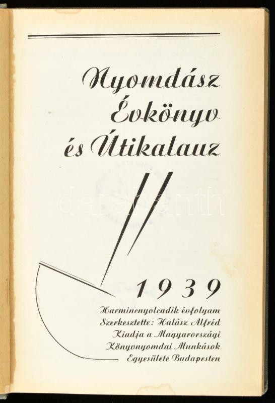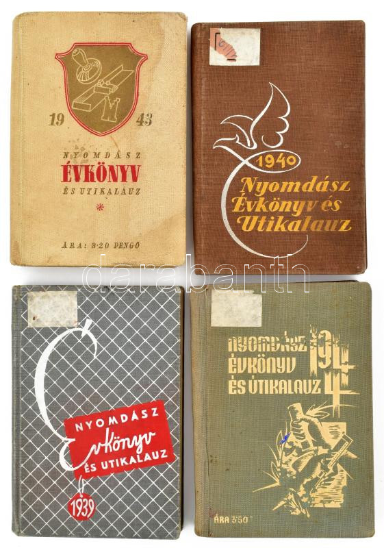 4 db klf Nyomdász évkönyv és utikalauz 1939, 1940, 1943, 1944. Kiadja a Magyarországi könyvnyomdai munkások egyesülete. Halász Alfréd (szerk). Bp., 1939-44. Gazdagon illusztrált, fekete-fehér és részben színes illusztrációkkal. Kiadói aranyozott egészvászon kötésben.