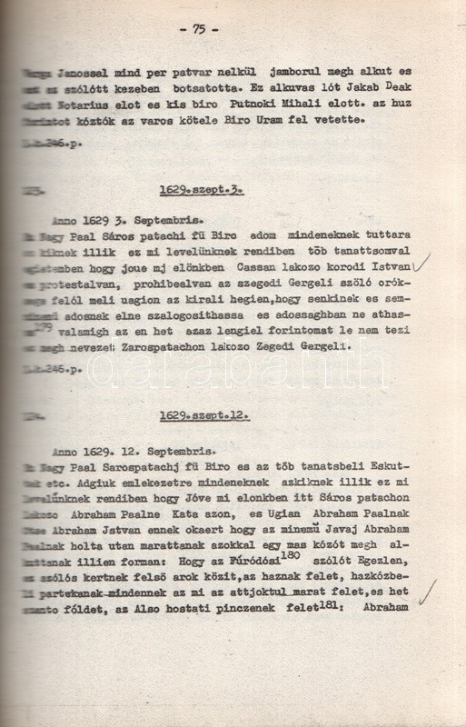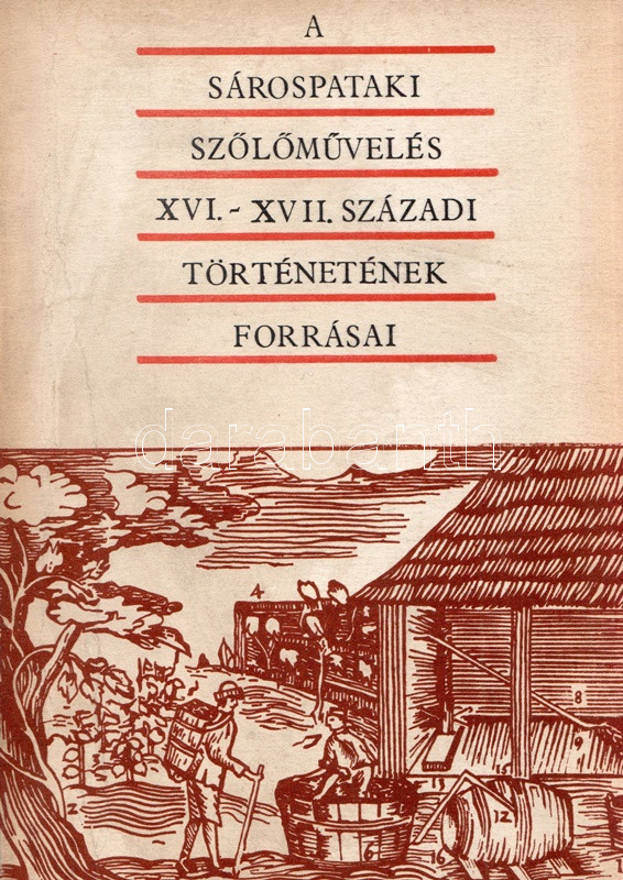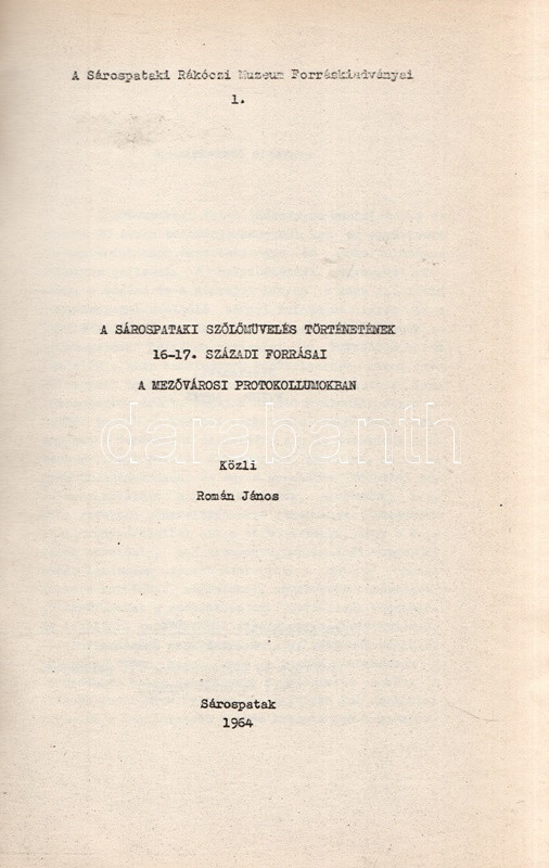 Román János: A sárospataki szőlőművelés történetének 16-17. századi forrásai a mezővárosi protokollumokban. Közli Román János. Sárospatak, 1964. (Múzeumok Rota Üzeme, [Budapest]). 227 + [1] p. Egyetlen kiadás. Összesen 400 példányban készült borászat-történeti forráskötetünk a sárospataki városbíró által fogalmazott, ellenjegyzett magyar nyelvű szőlészeti-borászati adásvételi dokumentumokat adja közre. A dokumentumok 1579-1699 között keletkeztek, és nem csupán a szőlészeti pereskedések mögött meghúzódó konfliktusokat, indulatokat és érveléseket örökítik meg, hanem egyszersmind rámutatnak a sárospataki szőlősgazdák gazdasági kapcsolatainak topográfiai vetületeire (az adásvételi formulák olykor nem éppen a szomszédban élő, kassai személyekhez is kötődhetnek). A kötet végén részletes névmutató. (A Sárospataki Rákóczi Múzuem Forráskiadványai 1.) Fűzve, színes, illusztrált kiadói borítóban.