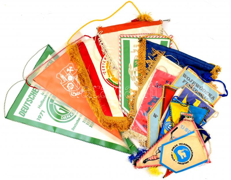 Leírás: 17 db sportzászló, többnyire külföldi, 14x10 cm és 30x48,5 cm közötti méretekben