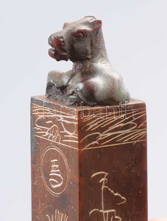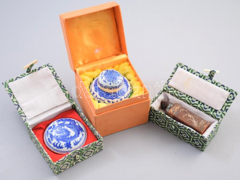 Leírás: Kínai 3 részes kalligráfia készlet: pecsétviasz tartó, tartalommal, faragott pecsételő, tintatartó edény. Mind dobozban.