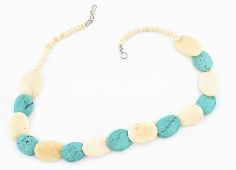 Leírás: Fehér korall és türkinin elemekből álló nyaklánc, h: 65 cm