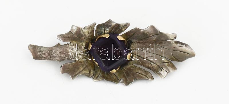 Leírás: Levél alakú bross, ametiszt berakással, h: 5 cm