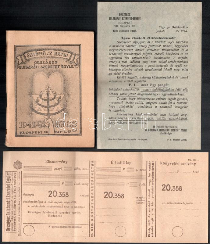 1941 Az Áhávász Reim Országos Felebaráti Szeretet Egylet zsebnaptára 1941-42. (5702.) Bp., Gewürcz Ferdinánd-ny., 104 p. Kiadói tűzött papírkötés, kissé sérült borítóval. + A naptárhoz mellékelt tájékoztató és postai csekk