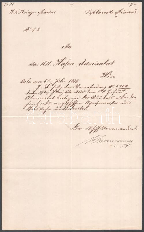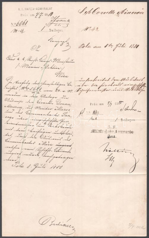 1880 Az S.M. Corvette Minerva parancsnokának kézzel írptt jelentése a Cs. k. Kikötői parancsnokságnak. A z érkezés igazolásával. / 1880 Handwritten report from the commanding officer of S.M. Corvette Minerva addressed to the K.K. Harbor Admiralty in Pola, Rubber stamps showing receipt at the Pola Harbor Admiralty and the k.k. Militär-Hoch-Kommando Pola. Rare original document.