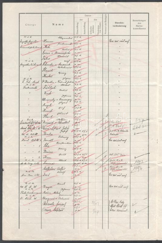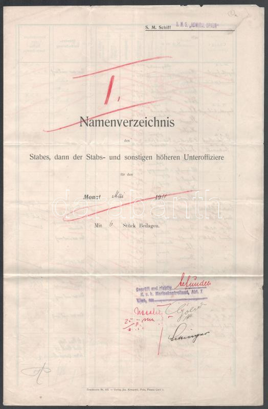 1911 Az S.M.S. Admiral Spaun osztrák-magyar hadihajó kimutatása a májusban fedélzetre lépett személyekről. A parancsnok aláírásával és a hajó pecsétjével, alul részletezve a személyek / Namenverzeichnis for the month of May 1911. Four-page document signed in Fiume on May 31, 1911, by the officer in command, Fregattenkapitän Alexander Hansa (born in 1863, gazetted Kontreadmirale on June 6, 1914), and Gesamtdetailofizier Linienschiffsleutnant Ferdinand Ritz, (born in 1872, gazetted Fregattenkapitän on May 1, 1916). Rear Admiral Hansa was in command in the Bocche di Cattaro in February 1918. See The Cattaro Mutinies in The Ports section of my collection. Seal: S.M.S. ,,ADMIRAL SPAUN" The following officers were on board S.M.S. Admiral Spaun during May, 1911: Linienschiffsleutnant Artur Spiess von Braccioforte (born in 1875, gazetted Linienschiffsleutnant November 1, 1904; Korvettenkapitän November 1, 1913) Linienschiffsleutnant Maurus Fabro (born in 1878, gazetted Linienschiffsleutnant on May 1, 1907; Korvettenkapitän May 1, 1916) Linienschiffsleutnant Wilhelm Grancich von Cetinathal (gazetted Linienschiffsleutnant on January 1, 1909; not found in the 1917 Rangliste) Fregattenleutnant Emmerich Schonta von Seedank (born in 1878, gazetted Linienschiffsleutnant on May 1, 1907; Korvettenkapitän November 1, 1916) Fregattenleutnant Wladimir Slawik (gazetted Fregattenleutnant on May 1, 1908, not found in the 1917 Rangliste) Fregattenleutnant George Kvekić (born in 1885, gazetted Seefähnrich on July 1, 1914; Linienschiffsleutnant on May 1, 1914) Linienschiffsarzt Dr. Eugen Bartha von Dalnokfalva (not found in the Rangliste for 1909 or 1917) Seekadet Oskar Fröhlich (born in 1891, gazetted Fregattenleutnant on May 1, 1913) Seekadet Seekadet Artur Esch (not found in the 1909 or 1917 Rangliste) Seekadet Johann Ulmansky von Vracsevgaj (born in 1891, gazetted Linienschiffsleutnant on May 1, 1917) Seekadet Edgar Angeli (born in 1892, gazetted Linienschiffsleutnant on May 1, 1917) Seekadet Erich Hansel (born in 1891, gazetted Linienschiffsleutnant on May 1, 1917) Seekadet Eduard Plašil (born in 1891, gazetted Linienschiffsleutnant on May 1, 1917)
