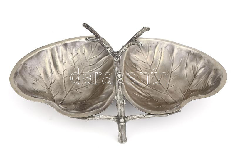 Leírás: Sandrik szecessziós ezüstözött alpakka kéttálcás kínáló. Faágakat mintázó lábazat- és fogórész, két levélformájú tálcával. Jelzett, 41x26x24 cm