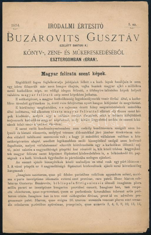 Leírás: 1874 Irodalmi Értesítő Buzárovits Gusztáv (ezelőtt Sartori K.) könyv-, zene- és műkereskedéséből Esztergomban (Gran). 1. sz. Magyar feliratú szentképek jegyzéke. Esztergom, Horák Egyed-ny., 2 sztl. lev.