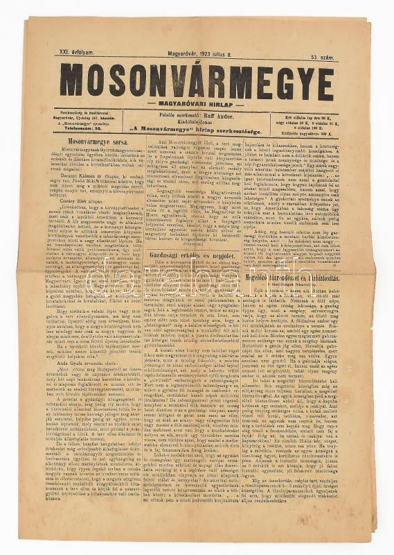 Leírás: 1922-1923 Mosonvármegye - Magyaróvári Hírlap 2 db száma