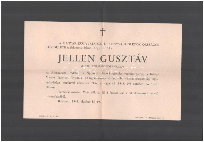 1943 Jellen Gusztáv (1892-1943) m. kir. kormányfőtanácsos, a Magyar Könyvkiadók és Könyvkereskedők Országos Egyesülete elnöke, az Athenaeum Irodalmi és Nyomda Rt. vezérigazgatója gyászjelentése, 20,5x29 cm