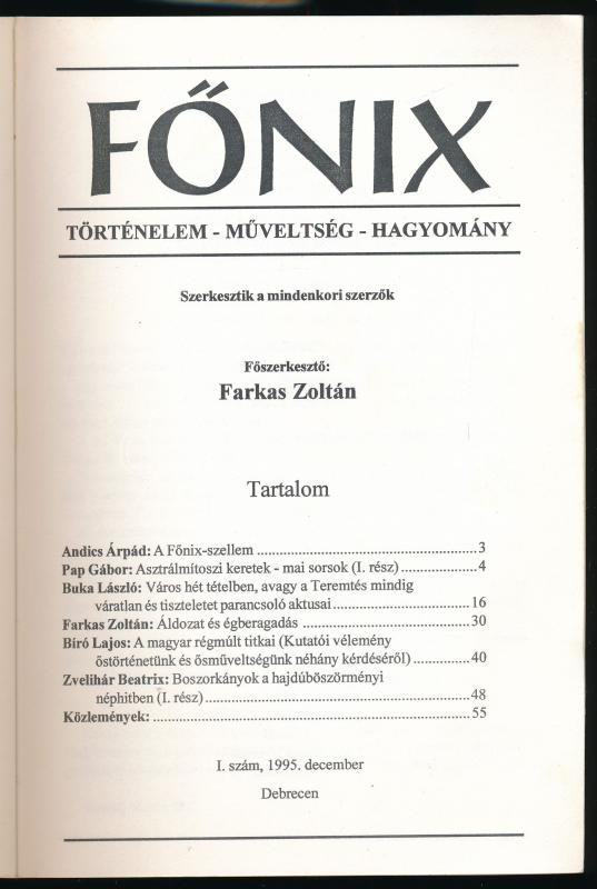 Leírás: 1995 Debrecen, Főnix, történelem - műveltség - hagyomány, főszerk.: Farkas Zoltán, I. szám.
