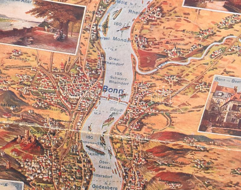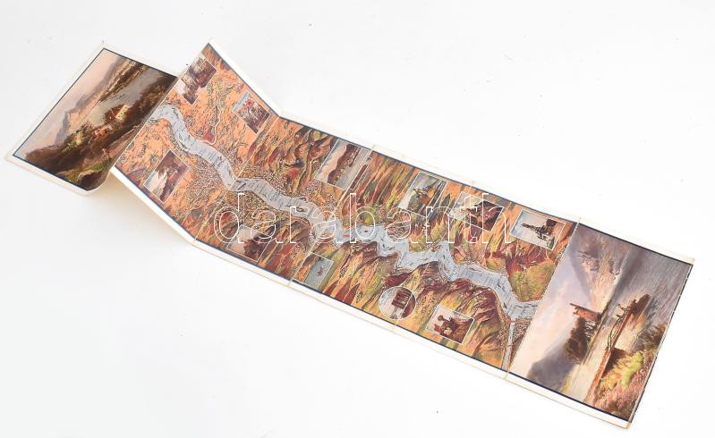 Leírás: A Rajna Köln-Mainz szakasza, kihajtható, színes panorámakép, német nyelvű ismertető szöveggel, kissé sérült, ragasztott, 164x19 cm